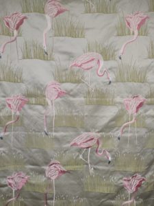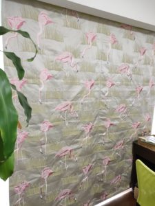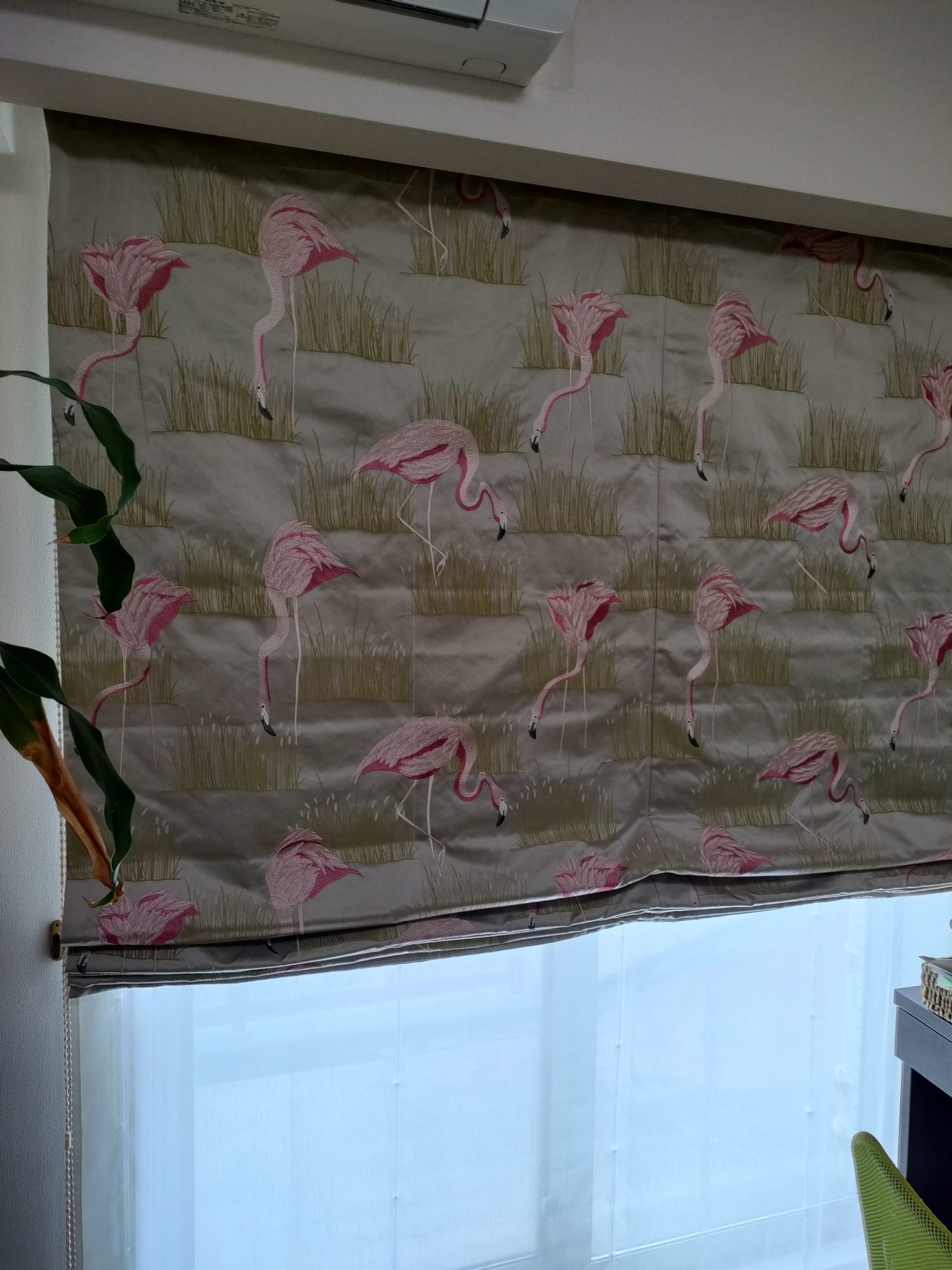 南国のリゾートの雰囲気のカーテンになさりたいとな事でしたので、フラミンゴ柄のシェードをお勧めしました。マナトレーディングさんの輸入生地でコットン素材でしたので、裏地もお付けいたしました。