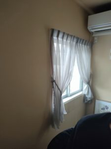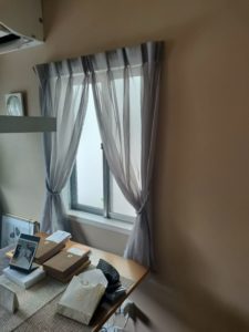 グレーと紫がかったグレーのグラデーションにゴールドの細いストライプのある生地です。とても柔らかいとろみのある生地なので、ドレープも綺麗にでました👍。お色も薄いグレーなので、とても雰囲気のあるおしゃれなお部屋になりました。